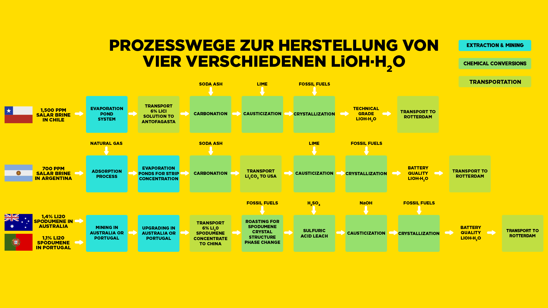 LiOH-H2O wird auf unterschiedliche Art, von verschiedenen Unternehmen aus unterschiedlichen natürlichen Rohstoffen hergestellt. Das bedeutet, dass es keine einheitliche Intensität der Produktion von LiOH-H2O CO2(?) gibt, sondern zahlreiche Unternehmen eine Vielzahl von LiOH-H2O Produkten anbieten. Minviro erstellte eine LCA für Lithiumhydroxid aus diversen Prozessen.