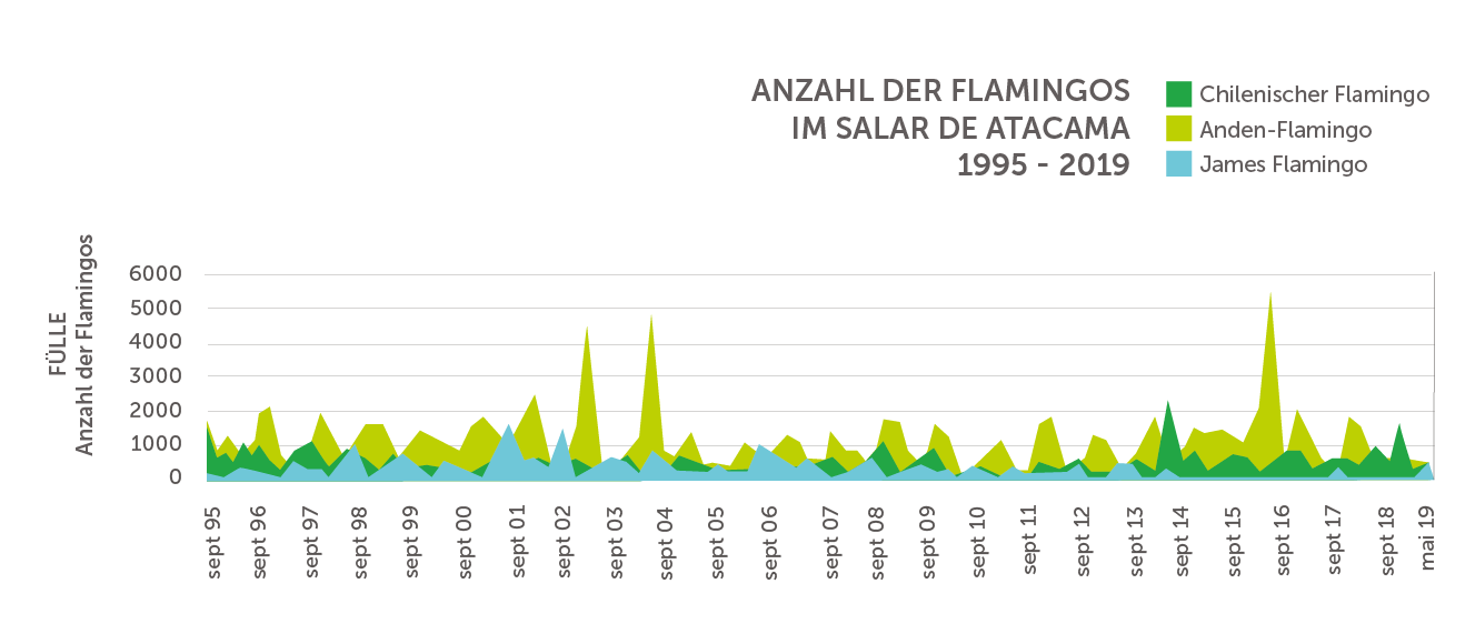 SQM beobachtet den Fortpflanzungszyklus der drei Flamingoarten in der Regionseit 2007. Die Grafik zeigt die Ergebnisse der Tierzählungen von 1995 – 2019.
